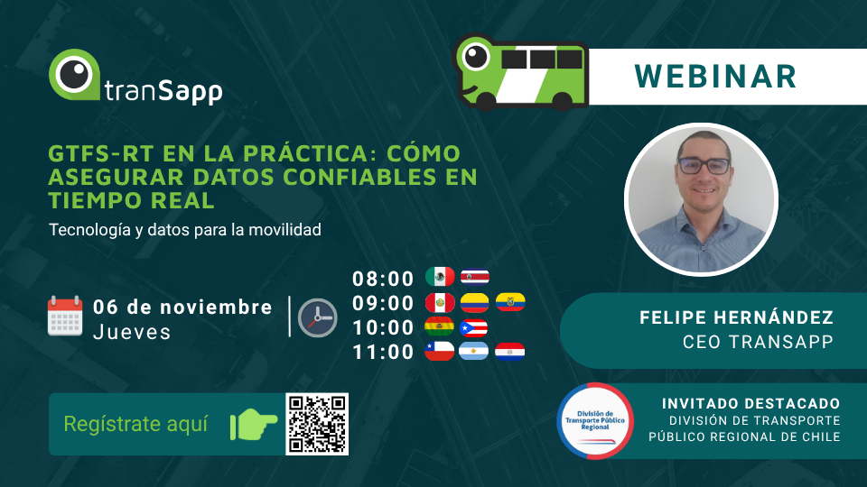Transapp organiza un webinar sin costo para dar a conocer la importancia y el impacto de la información en tiempo real (GTFS-RT) en la gestión del transporte público. La iniciativa busca mostrar cómo la implementación de este estándar permite mejorar la experiencia de los usuarios, optimizar la operación y fortalecer la transparencia de los sistemas de transporte, especialmente en América Latina, donde muchos servicios no operan bajo itinerarios fijos.
